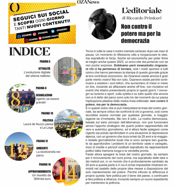 Torna in tutte le case il nostro mensile cartaceo dopo sei mesi di pausa. Un momento di riflessione utile a riorganizzare le idee, ma soprattutto le forze, fisiche ed economiche per poter finire al meglio anche questo 2023, un anno che sta portando con se non poche sorprese. Dobbiamo però innanzitutto ringraziare chi ci ha permesso di tornare, cioè i nostri sponsor e tutti coloro che hanno permesso la stampa di questo giornale grazie al loro contributo economico. Se Ozanews esiste ancora è gran parte merito vostro! Ma non solo, Ozanews esiste perchè continuano a esistere i suoi lettori, che aumentano di mese in mese on line, iniziando ad affacciarsi anche off line, con iniziative ed eventi che stiamo presentando proprio in questi giorni. I convegni su turismo e sport, sulla xylella e su tutto quello che ancora non si è detto del parco sono solo tre dei momenti da cui passa l’esplicazione plastica della nostra linea editoriale: non contro il potere, ma per la democrazia.