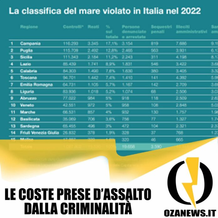 Il “mare violato”, oltre a concentrarsi nelle regioni a tradizionale presenza mafiosa, registra il primato della Campania con 3345 reati, seguita dalla Puglia con i suoi 2492 reati. Tutte violazioni che riguardano i seguenti settori: ciclo illegale dei rifiuti e mare inquinato; pesca di frodo, illegalità nel ciclo del cemento e violazioni del codice della navigazione, del codice della nautica da diporto e della normativa sulle aree protette. Se le violazioni penali sono cresciute del 3,1%, le violazioni amministrative hanno subito un incremento del 13.1%, segnale di evidenti fenomeni di aggressione al patrimonio naturale delle regioni costiere. Ragionando in termini economici, l’attività repressiva posta in essere dal Corpo delle Capitanerie di porto – Guardia Costiera e della Forze di polizia, riferibile ai sequestri ed alle sanzioni amministrative, ammonta a 486 milioni di euro.