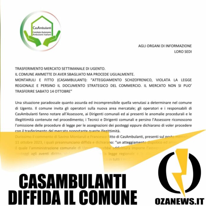 Il comune di Ugento si trova al centro di una controversia a seguito della decisione di spostare il mercato settimanale in una nuova area mercatale. La decisione, annunciata dal comune, è stata oggetto di contestazione da parte del sindacato “CasAmbulanti”. Il sindacato ha sollevato preoccupazioni riguardo alle procedure seguite dal comune nel processo di assegnazione dei posteggi e ha accusato l’amministrazione di violare la legge regionale e il Documento Strategico del Commercio del comune stesso.