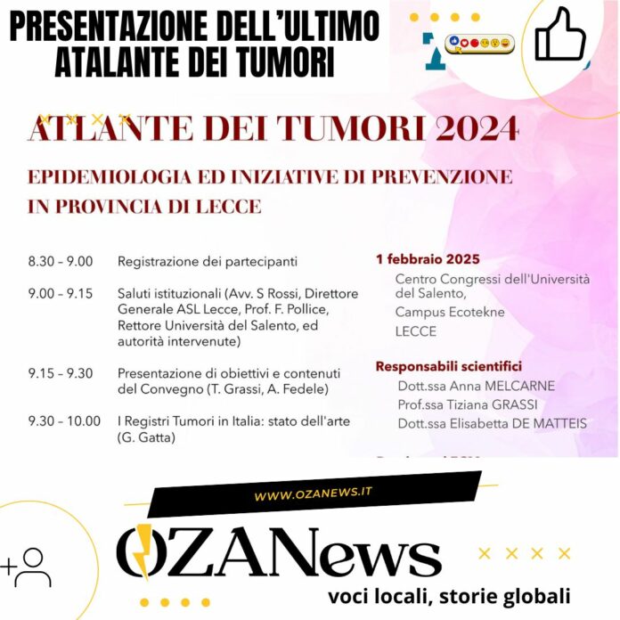 L’Unità Operativa ‘Registro Tumori’ ASL Lecce, in collaborazione con il Coordinamento del Registro Tumori Puglia presso l’AReSS Puglia presentaziono dell’Atlante dei Tumori 2024, un documento che analizza l’incidenza, la prevalenza e la sopravvivenza dei tumori nei 96 Comuni della provincia di Lecce, con particolare attenzione al periodo pandemico 2015-2020.
