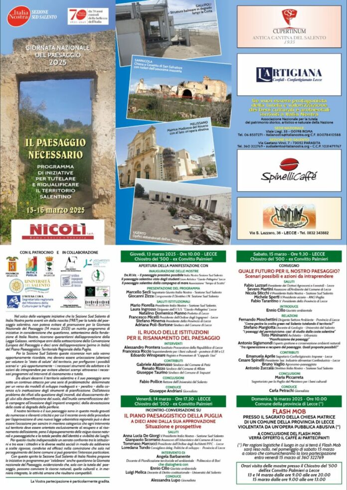 Dal 13 al 16 marzo 2025, la Sezione Sud Salento di Italia Nostra organizza un ciclo di incontri e mostre per sensibilizzare sul valore del paesaggio e sulla sua salvaguardia.