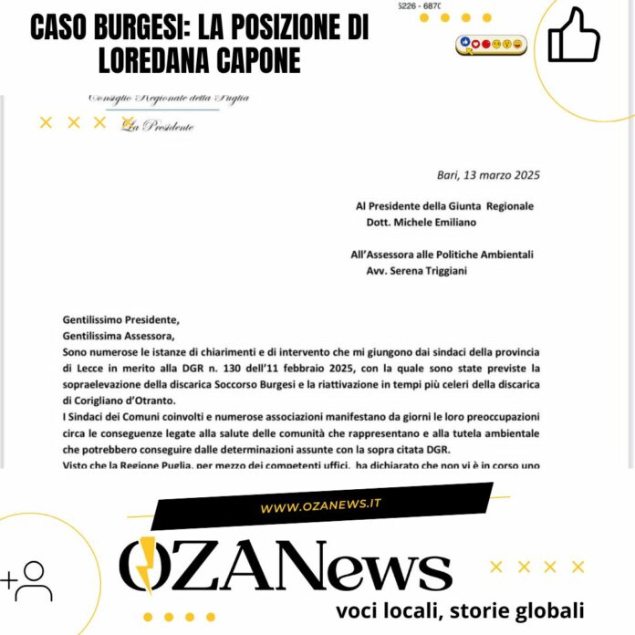 Dopo il consiglio straordinario tenutosi a Ugento sulla questione della discarica di Burgesi, arriva una presa di posizione ufficiale da parte della Presidente del Consiglio Regionale della Puglia, Loredana Capone. Con una lettera indirizzata al Presidente della Giunta Regionale, Michele Emiliano, e all’Assessora alle Politiche Ambientali, Serena Triggiani, la Capone ha chiesto un rinvio dell’efficacia della Delibera di Giunta Regionale (DGR) n. 130 dell’11 febbraio 2025.