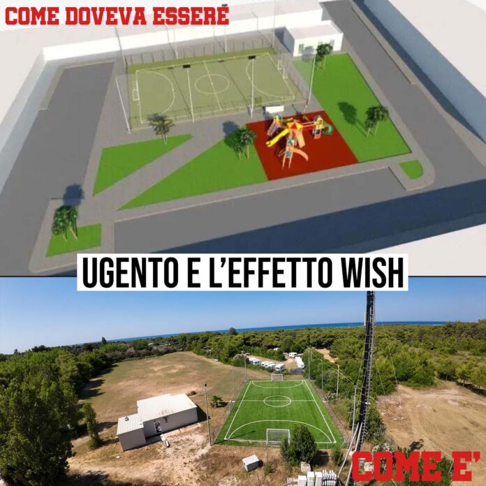 Peccato che la realtà, quella vissuta da chi nei campi ci gioca davvero (o ci proverebbe), sia un’altra. Appena si varca il cancello (quando c’è), si ha la sensazione di aver ricevuto un ordine da un e-commerce cinese di bassa lega: nella foto del sito il prodotto scintilla, nella confezione ti arriva una parodia. Ecco, questo è l’“effetto Wish”, che ad Ugento ormai è diventato una prassi urbanistica.