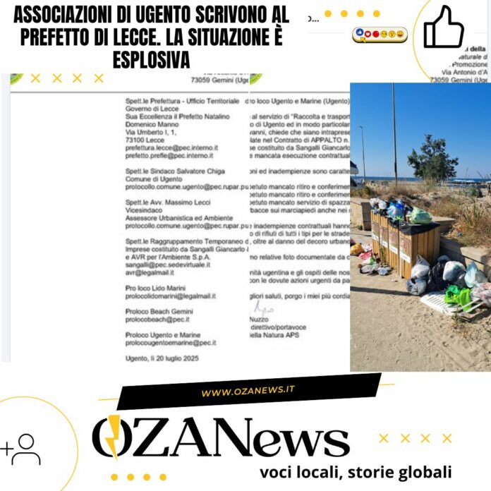 È una situazione al limite del collasso quella che si registra in questi giorni nelle marine di Ugento. Cumuli di spazzatura non raccolta, contenitori stracolmi e un degrado urbano visibile e crescente stanno esasperando cittadini, turisti e operatori economici. Una situazione ormai fuori controllo, tanto da spingere alcune delle principali realtà associative del territorio a fare un passo ufficiale: una PEC indirizzata al Prefetto di Lecce per segnalare il grave stato del servizio di raccolta e conferimento dei rifiuti urbani.