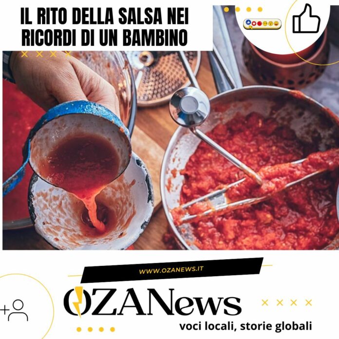 Un grande maestro della sociologia come Emile Durkheim ci spiega che le “tradizioni” sono strettamente legate al concetto di cose sacre e di rituali, essenziali per la coesione sociale, cioè la capacità di una società di assicurare il benessere della collettività, basandosi su relazioni sociali solide, senso di appartenenza condiviso, qualità dei legami tra le persone, solidarietà e capacità di affrontare insieme sfide e difficoltà. E la coscienza collettiva, che è l’insieme delle credenze, dei sentimenti e dei valori condivisi dai membri di una società, che trascende le singole coscienze individuali e fornisce un quadro di riferimento per l’azione sociale. Le tradizioni riassumono le credenze e le pratiche riguardanti oggetti ed eventi sacri, che servono a rafforzare i legami sociali e a mantenere l’ordine sociale. La preparazione della salsa di pomodoro è una delle poche tradizioni che resiste nel tempo, che sembra non cadere in quel dimenticatoio, ove stiamo tendenzialmente riversando ogni senso di comunità, schiacciandolo con il ricorso smisurato alle tecnologie digitali che occupano completamente le nostre vite. La salsa è e rimane un rito perché ad esso connetto la memoria ed il ricordo mi riporta agli anni della minore età. Ricordo che in quegli anni le spremi pomodoro elettriche non esistevano. La spremitura dei pomodori bolliti con cipolla, basilico e sale, avveniva a mano con una macchinetta, mossa dalla mano a ritmo di tac tac. Ovviamente era il nonno a svolgere le mansioni più pesanti e pericolose: spremitura, movimentazione dei pomodori, tappatura delle bottiglie bollenti di salsa che venivano poi sistemate a strati all’interno di grandi cassoni artigianali. Io non lo mollavo un attimo. Per bollire i pomodori inventò una sorta di fornace alimentata con segatura di legno molto fine. Una volta accesa, la fiamma si autoalimentava ed i pomodori venivano bolliti in un non nulla. La cottura finale delle bottiglie avveniva con la tecnica “a bagnomaria” all’interno di enormi cassoni pieni d’acqua. Siccome il nonno era di un’intelligenza sopraffina, pur non avendo “e scole tise” li realizzò da solo tagliando simmetricamente un bidone/fusto di metallo per uso industriale. La salsa dell’estate era un appuntamento fisso a cui ancora oggi nessuno può sottrarsi. Un rito antico che nonostante le varie proposte commerciali, ancora si ripete, anno dopo anno, in tante famiglie.
