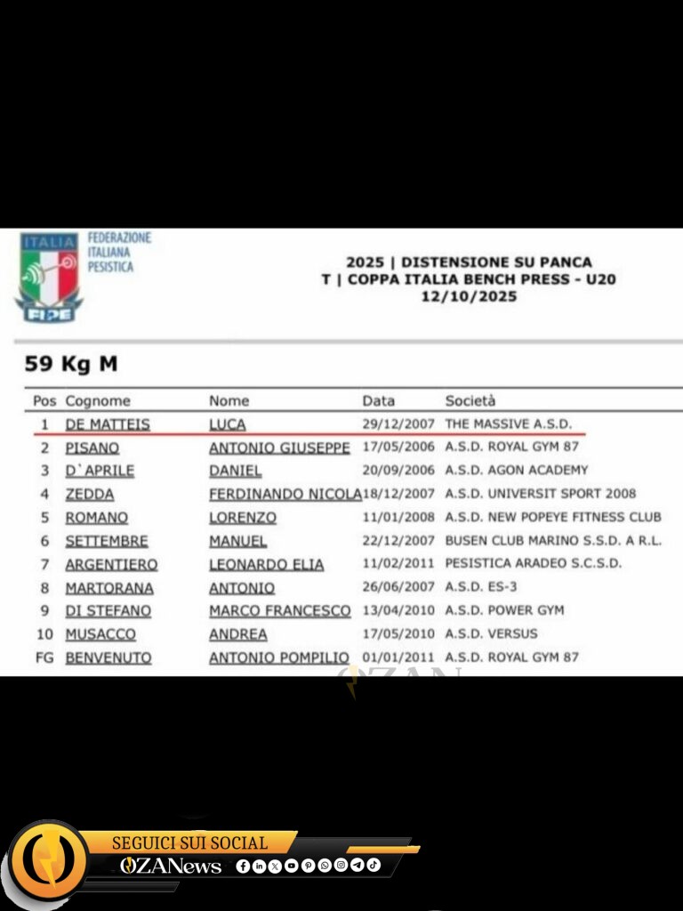 Ancora una grande soddisfazione per la The Massive A.S.D.: Luca De Matteis, accompagnato dal suo coach Davide Caputo, si è laureato campione nazionale nella categoria 59 kg maschile alla Coppa Italia di Distensione su Panca Under 20, disputata il 12 ottobre 2025 sotto l’egida della Federazione Italiana Pesistica (FIPE), .
