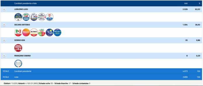 Significativo anche il risultato ottenuto dalla lista Lega Puglia che totalizza 444 voti (l’11,39%) , dove spicca DE BLASI GIANFRANCO DETTO GIANNI con 239 preferenze.