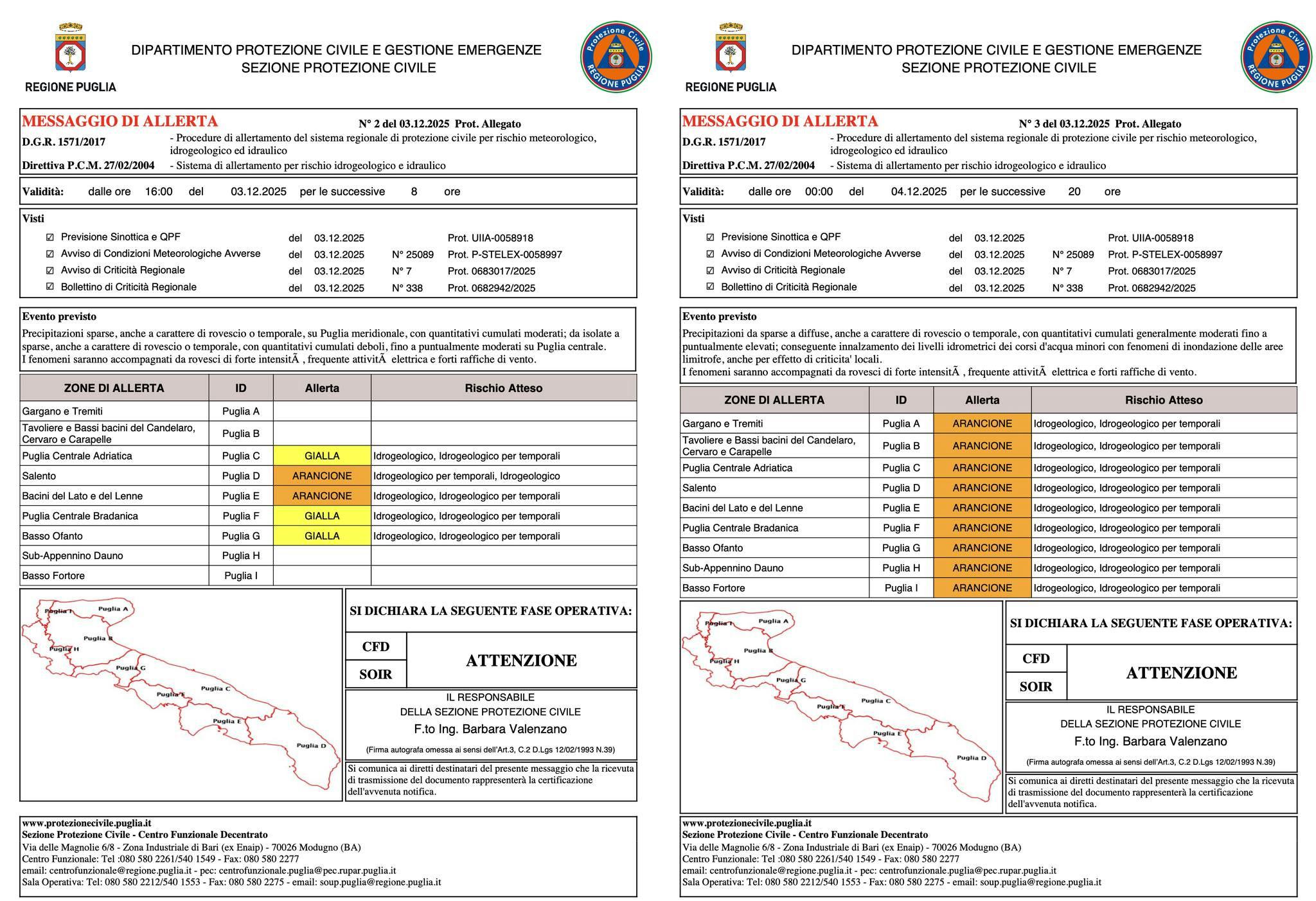 Il responsabile della Sezione Protezione Civile, Ing. Barbara Valenzano, ha comunicato l’attivazione delle fasi operative di ATTENZIONE per il CFD (Centro Funzionale Decentrato) e per il SOIR (Sale Operative Integrate Regionali). La ricezione e trasmissione del messaggio costituiscono certificazione dell’avvenuta notifica.