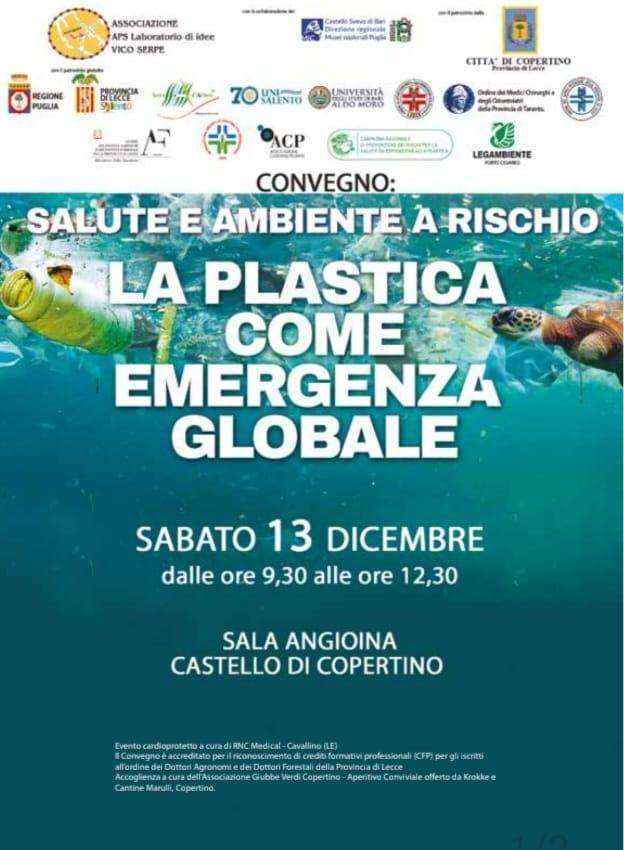 Salento – si avvicina l’appuntamento con il convegno “Salute e ambiente a rischio. La plastica come emergenza globale”, in programma sabato 13 dicembre a Copertino. L’evento, che si tiene nella Sala Angioina del Castello, si focalizza sulle criticità ambientali e sanitarie legate all’inquinamento da plastica, tema che oggi riguarda tutto il territorio salentino e la più ampia Regione Puglia.