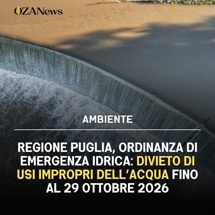 Il presidente della Regione Puglia, Michele Emiliano, ha emanato oggi l’Ordinanza n. 586, con la quale vengono introdotte misure urgenti per far fronte alla crisi idrica 2025-2026 nel comparto potabile. L’ordinanza resterà in vigore fino al 29 ottobre 2026, in coincidenza con lo stato di emergenza regionale dichiarato per rischio da deficit idrico.