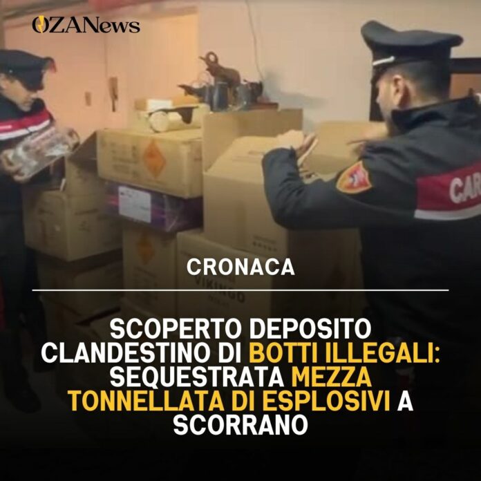 L’operazione è scattata a Scorrano, dove i militari della Sezione Operativa della Compagnia Carabinieri di Maglie hanno scoperto un vero e proprio deposito clandestino di materiale esplodente all’interno dell’abitazione di un 70enne del posto. Durante la perquisizione, i Carabinieri hanno rinvenuto circa 500 chilogrammi di artifizi pirotecnici, molti dei quali non classificati, manomessi o alterati, custoditi in modo estremamente pericoloso nel garage interrato dell’immobile.