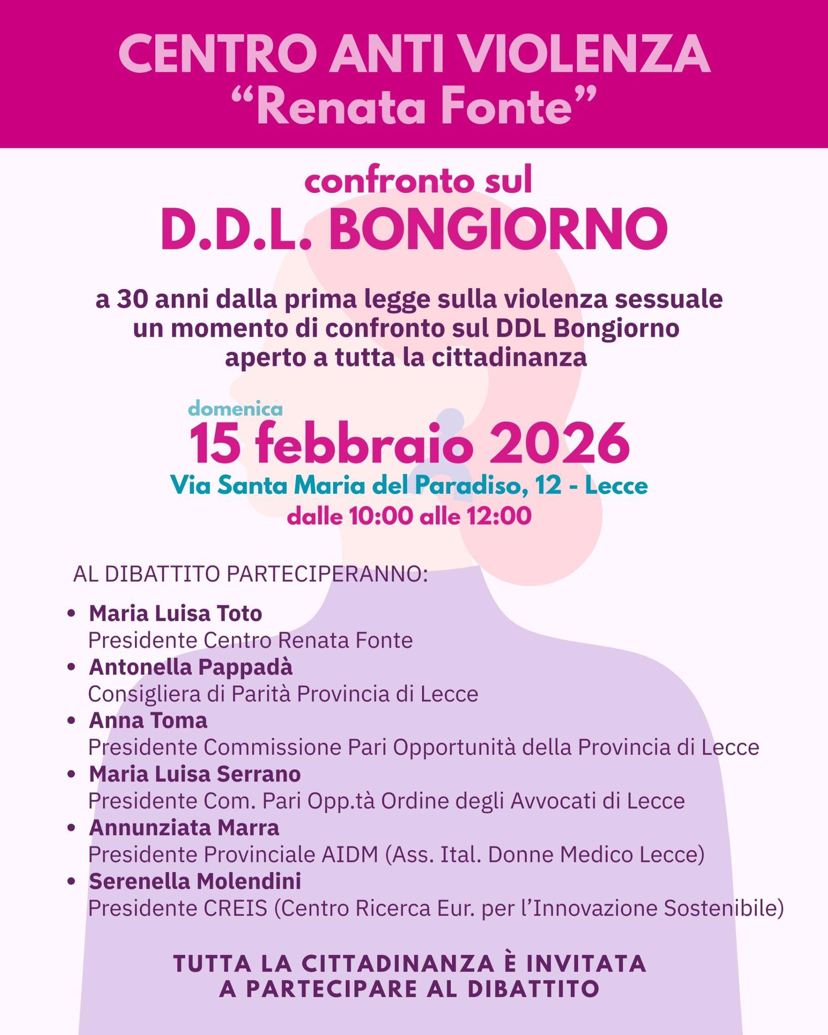 Lecce – È in programma domenica 15 febbraio un momento di confronto dedicato al Decreto Bongiorno, a trent’anni dalla prima legge sulla violenza sessuale. L’iniziativa, promossa dal Centro antiviolenza Renata Fonte di Lecce, si svolgerà in via Santa Maria del Paradiso 12, presso il capoluogo salentino, e rappresenta un’occasione di dialogo aperto alla cittadinanza.