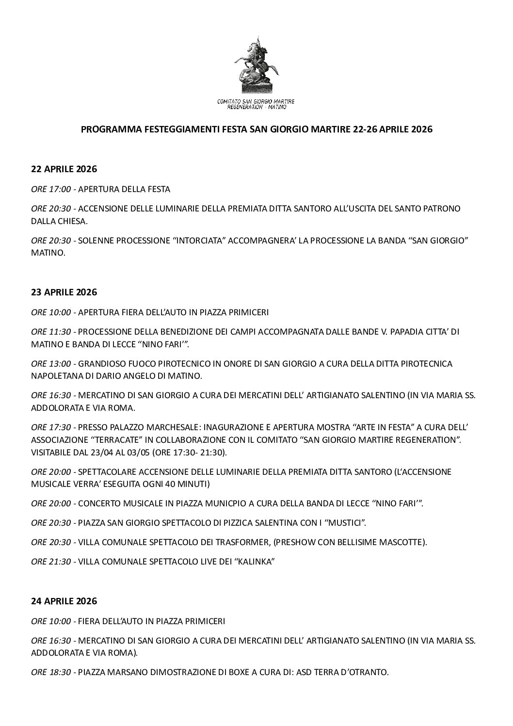 Il 23 aprile è la giornata più ricca di appuntamenti: fiera dell’auto in piazza Primiceri, processione della benedizione dei campi con le bande V. Papadia Città di Matino e Banda di Lecce “Nino Farì”, fuoco pirotecnico, mercatino di San Giorgio, inaugurazione della mostra al Palazzo Marchesale, accensione musicale delle luminarie, concerto in piazza Municipio, spettacolo di pizzica con i Mustici, show dei Transformer in villa comunale e live dei Kalinka.